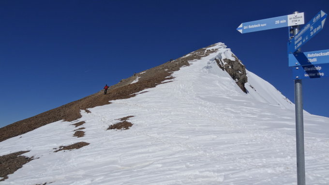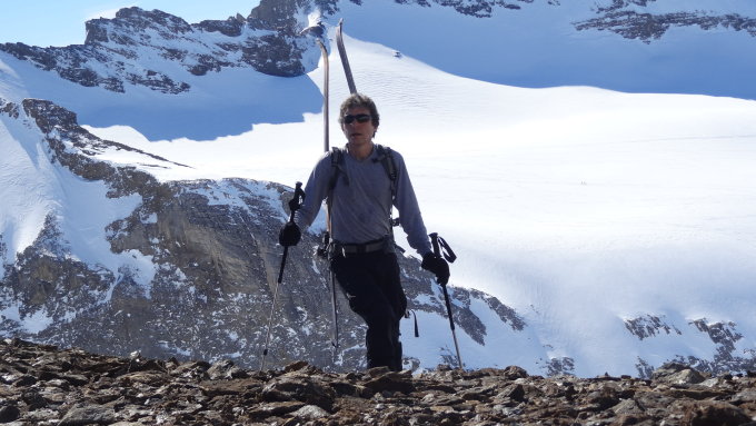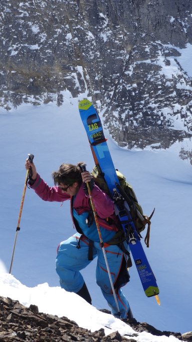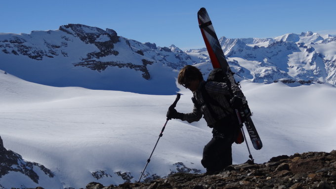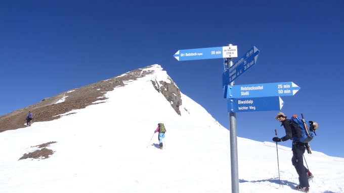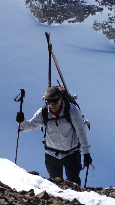Aufstieg über den 45° steilen Südhang 2600-2741m. Schnee sollte bereits ein bisschen durch die Sonne aufgeweicht und griffig sein. Harscheisen zwingend. Letztes Stück zu Fuss, da Aufstiegspur verfahren und Grip schlecht.