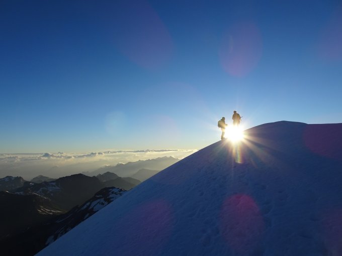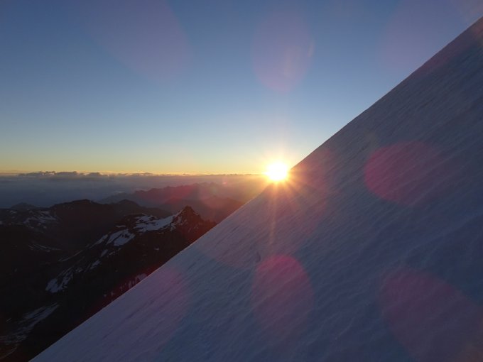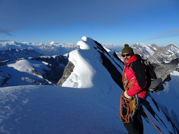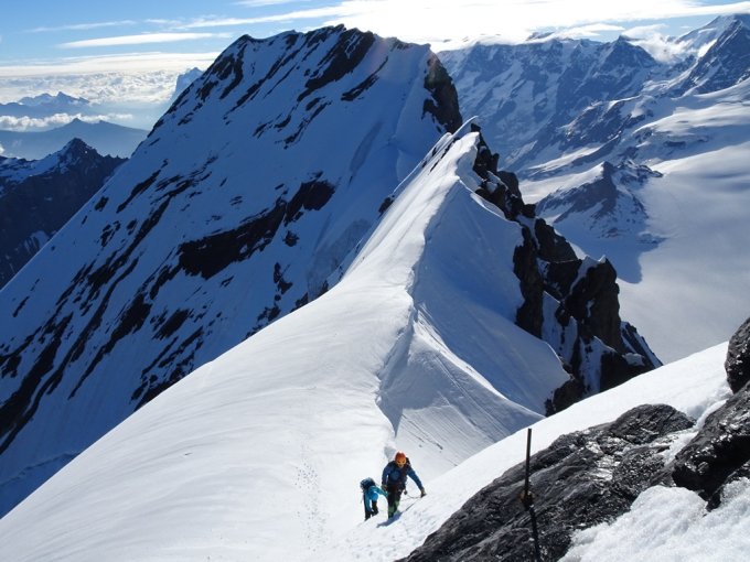 Bis zum Steilaufschwung Morgenhorn weicher Schnee und einige Male in Löcher eingebrochen. Aufschwung selbst hat eine Blankeisstelle, weiter oben auch Blankeis mit Schneeauflage.