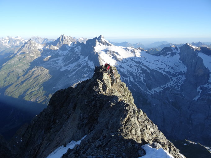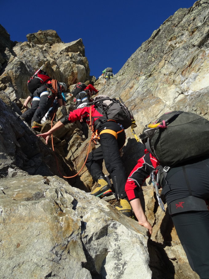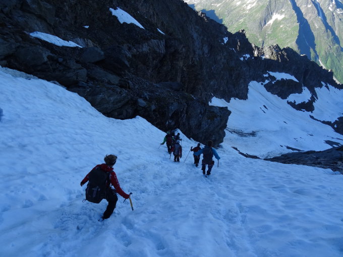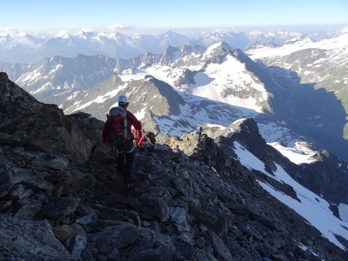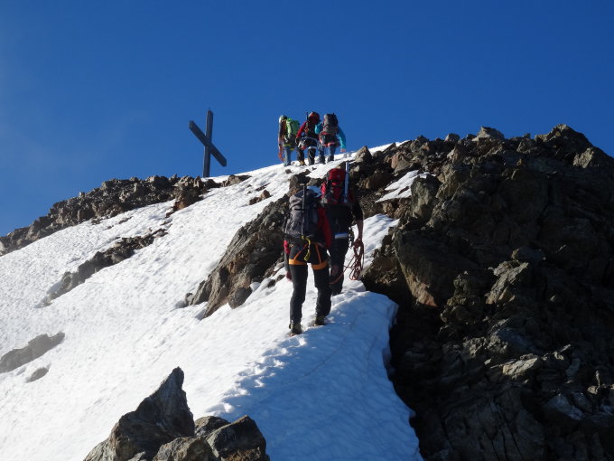 Gletscher guter Trittschnee, Grat schneefrei und trocken. Im Abstieg über die Normalroute hübsche Schneefelder die ein zügiges und Gelenkschonendes Absteigen ermöglichen. Abstieg zur Hinter Balmhütte.