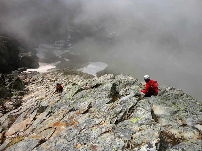 Nach nächtlichem Regen Grasrücken zum Tschingelseeli noch nass und etwas rutschig, aber gute Wegspur ab Brücke im Brunnital. Felsen am Südgrat trocken, erfordern im unteren Teil jedoch etwas Vorsicht, da mit feuchtem Moos durchsetzt. Der etwas ausgesetzte Einstieg ist mit einem Fixseil versehen, dann schöne Kletterei in plattigem, weiter oben eher schrofigem Gelände (bis II).