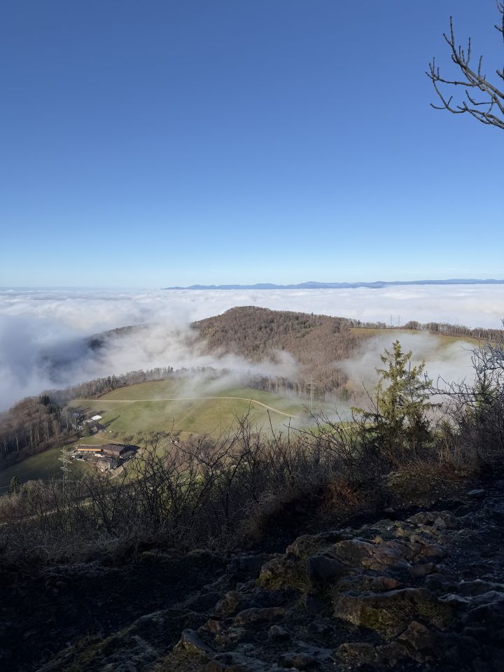 Wind, Eisregen von den Bäumen, Sonne über dem Nebelmeer