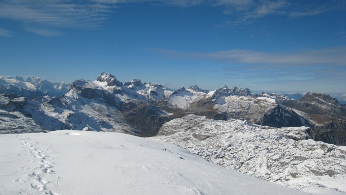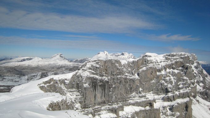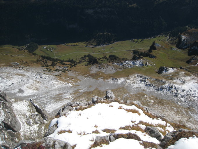 Außer zwei Rudeln Gämsen war heute niemand unterwegs. Letzteres hat mir auf dem Plateau sogar den Weg gewiesen, sehr praktisch. Gamaschen wären kein Luxus gewesen. Es wintert sehr in dem Gebiet. Aber nochmals warme Temperaturen gesucht und bekommen.