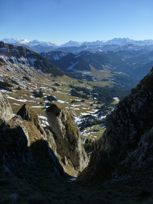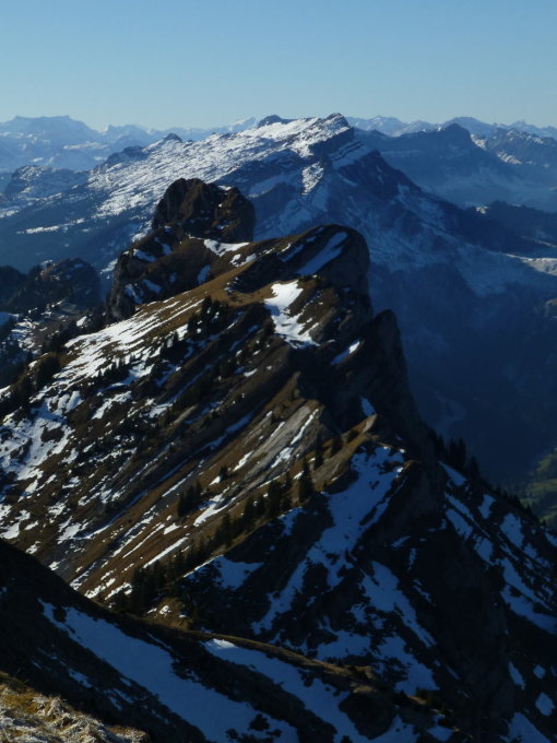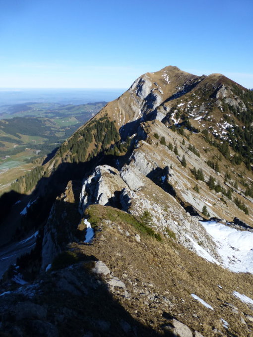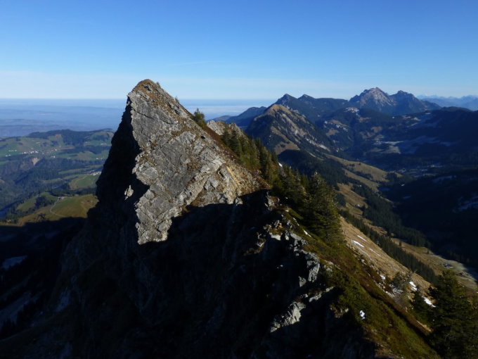 Sonnig und mild, bei W-SW-Wind auf dem Grat z.T. kühl. Grat weitgehend trocken, Richtung Flühli zunehmend gefrorene, aber griffige Schneereste, Rauhreif und z.T. Wassereis. Im Grönflue S-Couloir Vorsicht wegen Steinschlag (Gemsen!). Die Nächsten sollten ca. 1,5m Reepschnur zum Ersetzen der Schlinge beim dortigen Abseilstand mitnehmen.