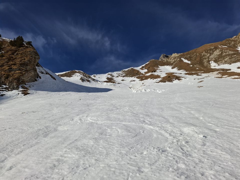 Abfahrt Bürgle. Gipfelhang sehr schön. Morgetepass harte Abrutschstelle. Bis