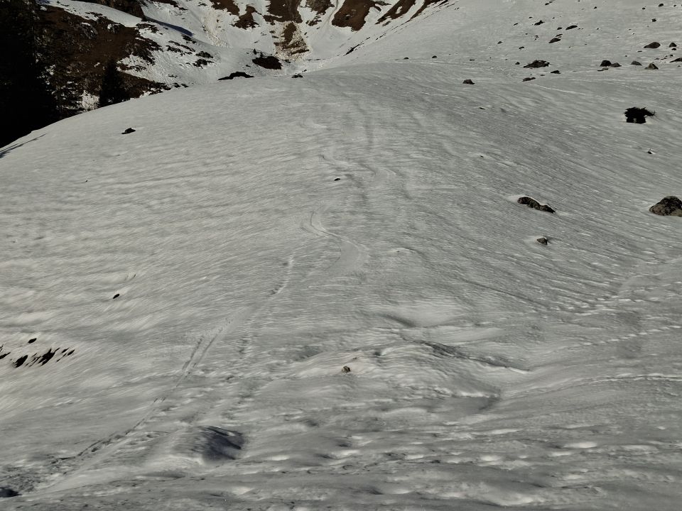Ochsen Abfahrt: Hart aber recht griffig dank der Sonne. Es hat noch Schnee auch wenn viel Gras zu sehen ist.