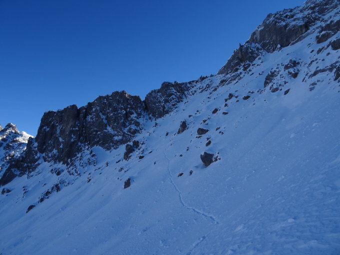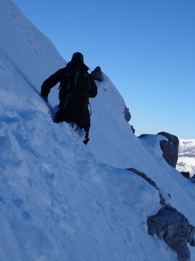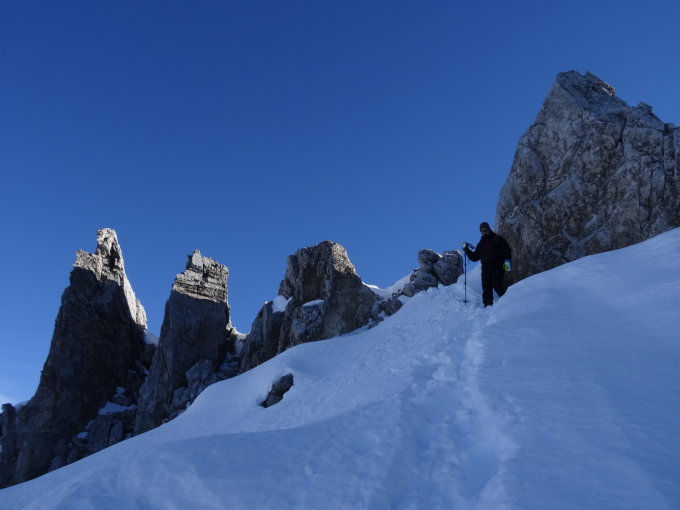 Bis zum Fürggli profitierten wir von der frischen Schneeschuhspur. Der Grat zum Saaser Calanda ist gut begehbar. Die Nordflanke vom Saaser Calanda wie auch von der Plattenflue/ Kammerastäga hat reichlich Pulver drin. Hier wären Skis noch angebracht gewesen, aber den einten oder anderen Steinkontakt hätte man sicher riskiert. Vom Hasenflüeli zum Eggberg wieder angenehme Gratwanderung.