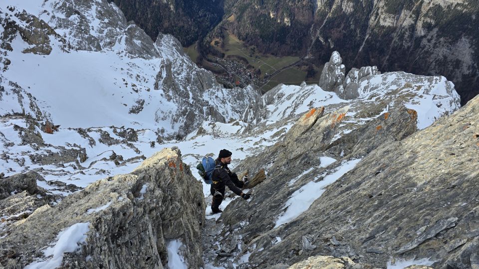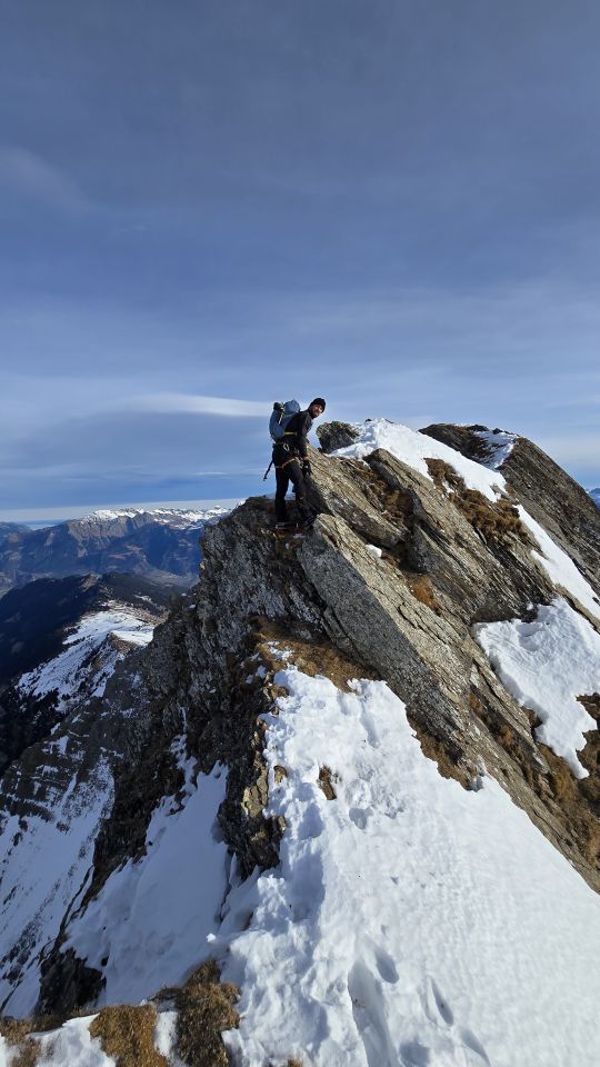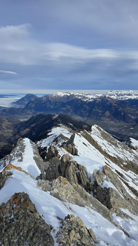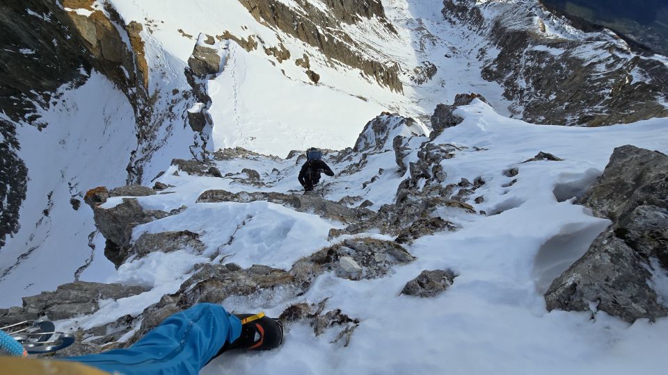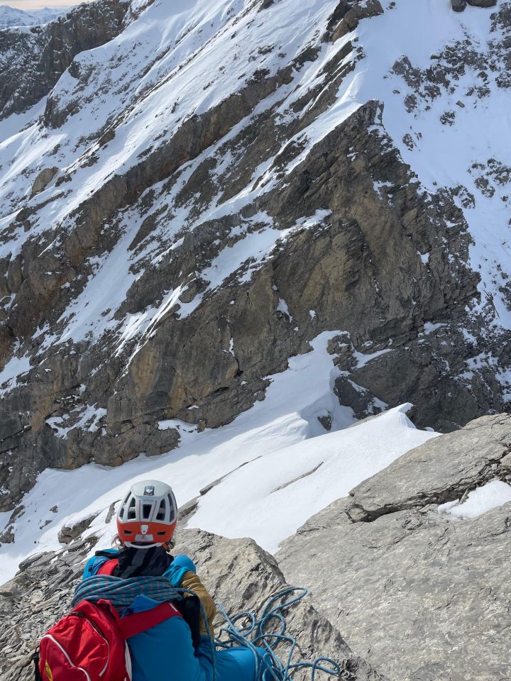 Bis zum Calanatörli fast schneefrei. Dann am Grat entlang oft auch schneefrei oder nur kurz Schnee. Ab Rossfalla oft Schnee, wenn auch nicht tief aber oft griesig. Teils auch Triebschneetaschen. Napoleon geht gut zu Fuss runter, wir haben aber geseilt dort. Zum Calanda alles im Schnee, runter bis zum Dach auch meist Schnee, dann oft aper.