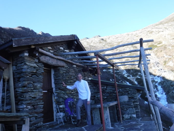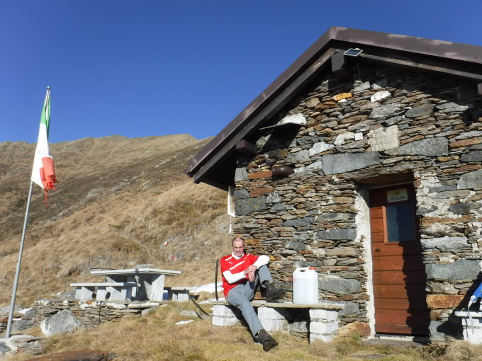 Das italienische Bivacco Giorgio Ielmoni unterhalb vom P 2138 wird selten besucht, denn es gibt keinen markierten Weg dorthin aus dem italienischen Valle Cannobina hinauf, sondern nur vom Südgrat 300 m hinab. Das Hüttenbuch vom 20.6.2009 ist noch nicht mal zur Hälfte voll. Letzter Eintrag war am 27.8.2016. Das Steinhüttchen bietet zwar lediglich 4 Schlafplätze mit Iso-Matten, ist jedoch sehr gut ausstaffiert mit Kanonen-Ofen, Gaskartuschen-Kocher, sowie diverse Getränke-Packungen unterm Dach mit Kasse des Vertrauens. Die Üblichkeiten Tessiner Selbstversorger-Hütten machen sich hier positiv bemerkbar. Den Versuch, vom Biwak ostwärts zum Grenzstein 22 (P 1963) weglos zu queren, gab ich nach der Hälfte auf, da zwischendrin 3 Bachrinnen und felsiges, verstrauchtes Gelände vorherrschen, so daß ich weglos, etwas mühsam zum Cruit wieder hinauf stieg und von diesem auf deutlichen Wegspuren hinab zum P 1963.