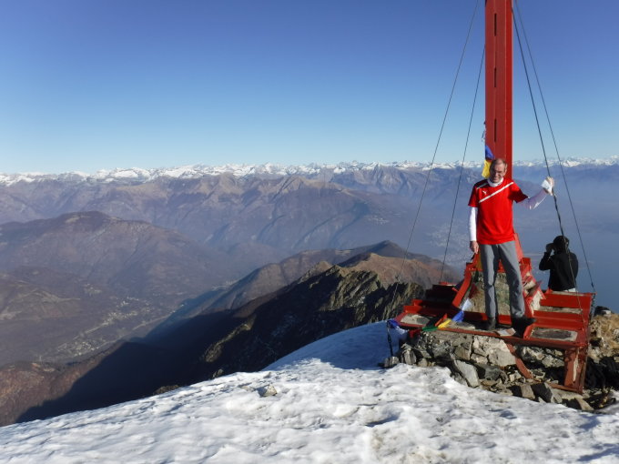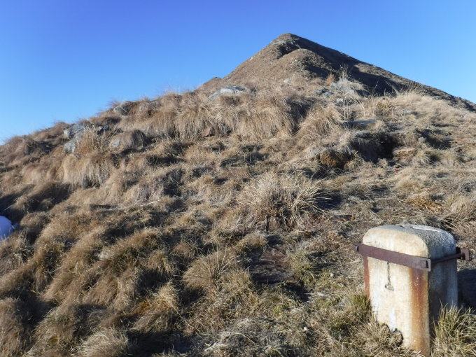 Tourenbeginn um 08:35 Uhr bei -1°C unter wolkenlosem Himmel. Viele Passagen waren schneefrei bis auf alternativen Sommerweg durch die Ostflanke des Gridone, der ungespurt blieb. Denn einfacher und schneeärmer steigt man um diese Zeit über den Ostgrat an dessen linken Seite zum Grenzkamm südlich vom Steinturm P 2138 auf und folgt auf diesem zum Gipfel. Hier gab es reichliche Fußspuren im wenigen Schnee.