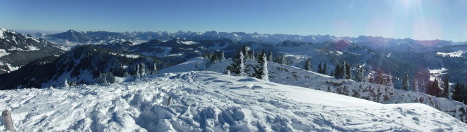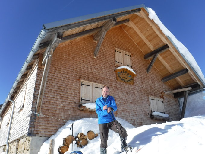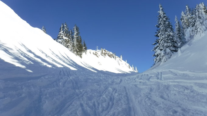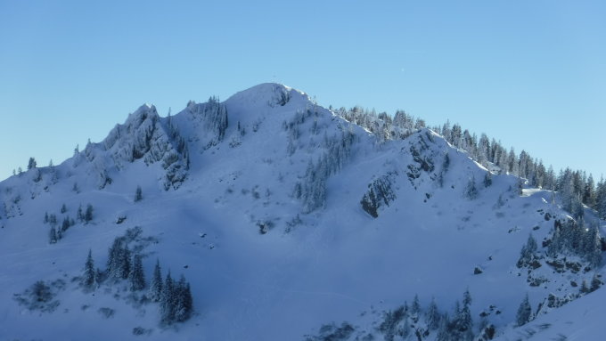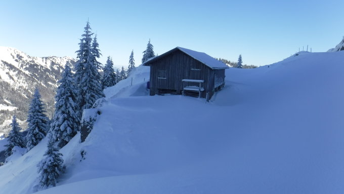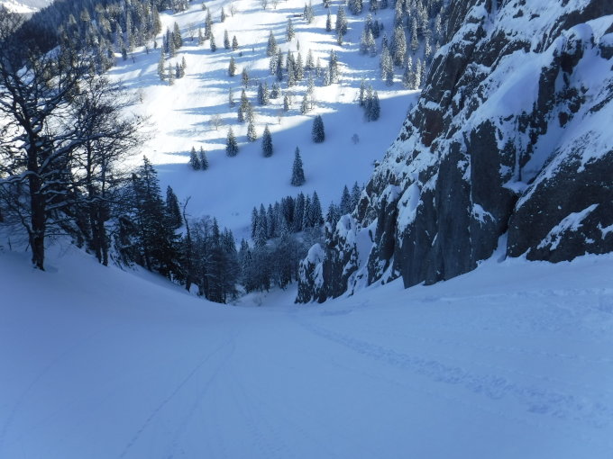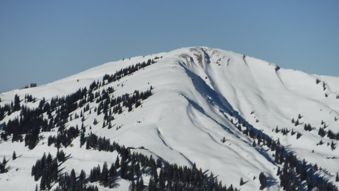 In beschriebener nordseitiger Abstiegsroute gab es lediglich 2 Abfahrtspuren weit links von der Feld-Alpe vorbei hinab in den Tobel oberhalb Oberen Hirschgrunds. Links davon eine wie mit Lineal gezogene Skitourengänger-Aufstiegsspur unterhalb der Siplinger Alpe aus dem Schwarzenberg-Tal heraus hinauf zum Gipfel.