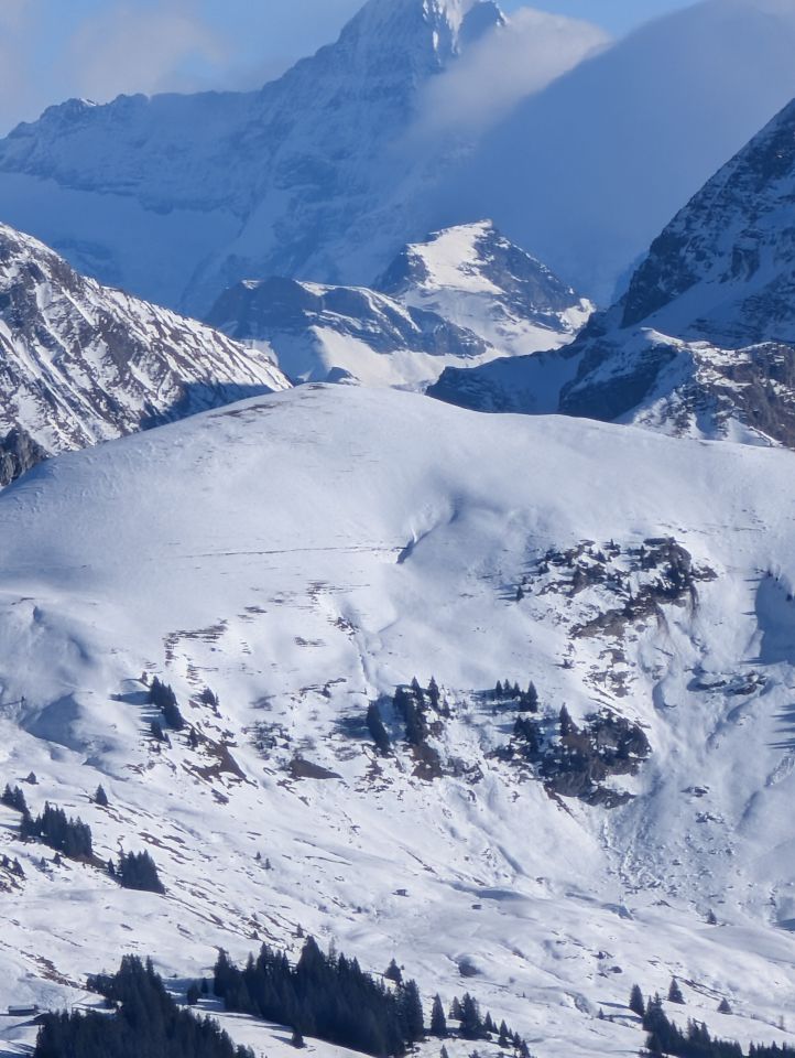 Es gibt gerade so genug Schnee. Trotz Sonneneinstrahlung ist es überall ziemlich hart – selbst gegen 13 Uhr noch. Die Abfahrt fühlt sich eher wie eine präparierte Piste an.