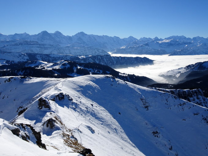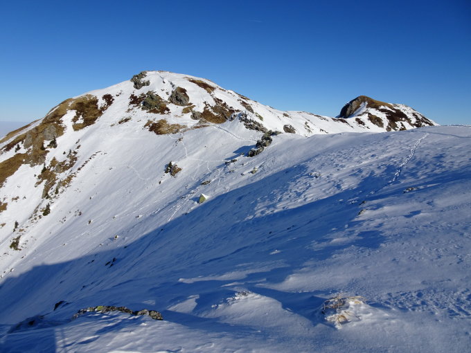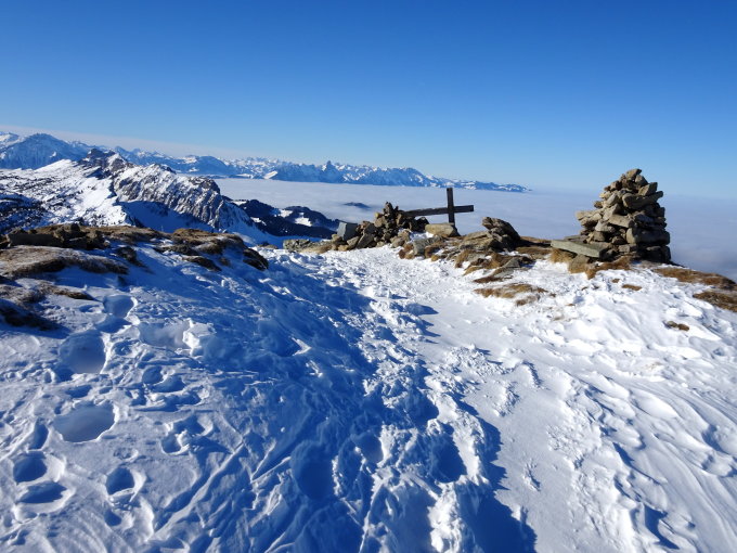 Im Aufstieg bis zur Chrinde nur im Pullover, bis zum Gipfel wurde die Bise stärker da gab es eine kalte und kurze Gipfelpause.