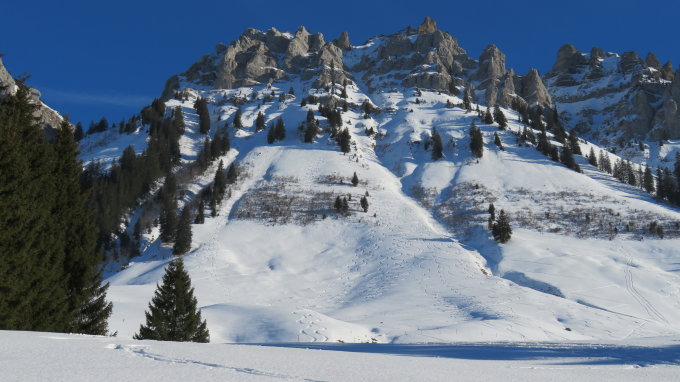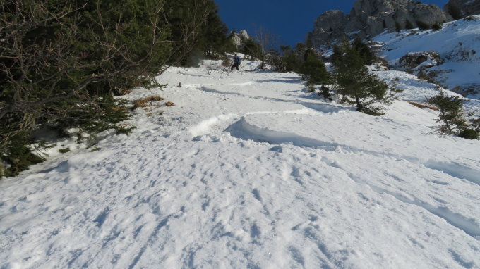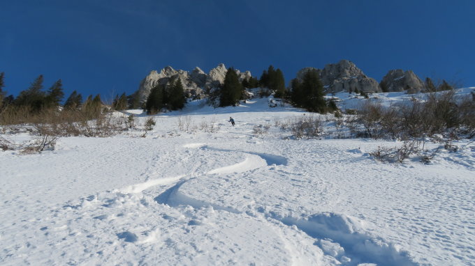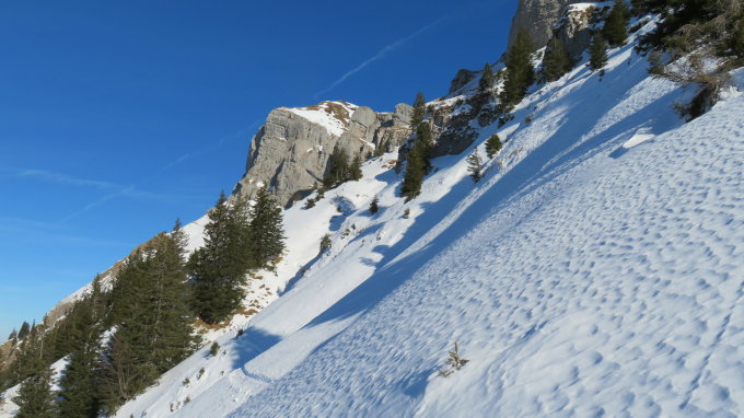 Diese Route ist mit einem S nur bei sicheren Verhältnissen zu empfehlen da man auf 100hm im Hang um 42° aufsteigt