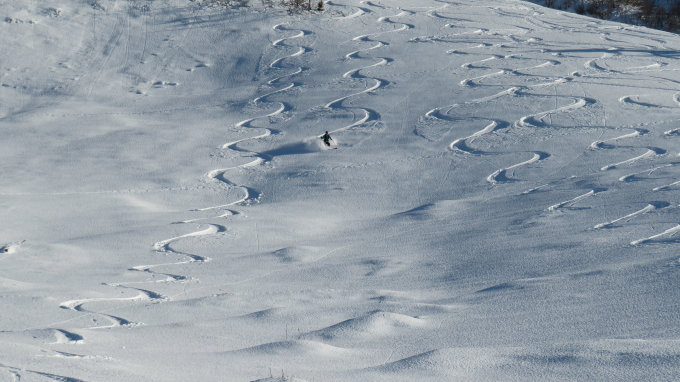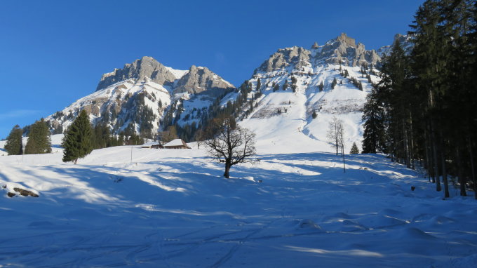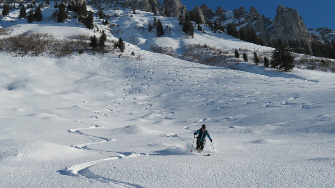 Heute Traumverhältnisse mit 30-50cm Pulverschnee in der Chrinderinde und seinen schön auslaufenden Westhängen zur Untere Breitwang hinunter.