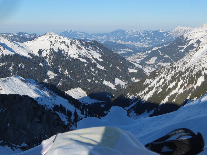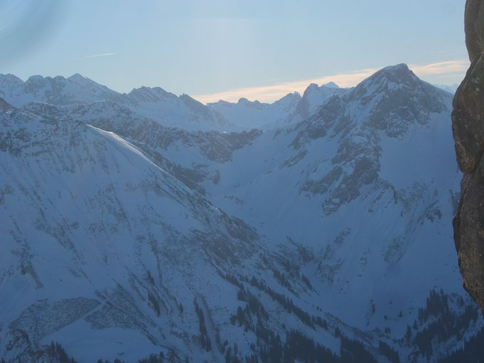 Anschließend Aufstieg zum Älpelekopf. Der Gipfelaufstieg war schon recht knifflig, da in der weiche Schnee kaum Halt auf den Graspolstern hatte. Deshalb in die Schrofen ausgewichen. Nach Durchstich der Wechte problemlos zum Gipfel.