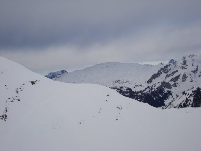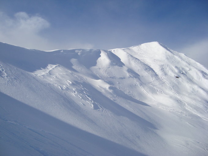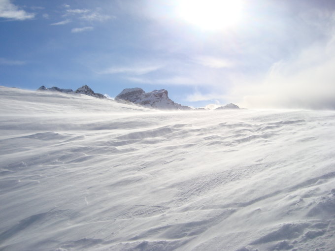 Vom Gipfel bis zum Hüttenboden mal mehr- mal weniger windgedeckelter Pulver, in den windabgewanden Expositionen fast ohne Deckel.