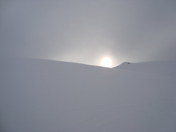 Doch dann kam starker Wind aus S/SW auf, welcher mich bis zum Gipfel begleitete. Dieser vertrieb den Nebel und machte den blauen Himmel zwischen ein paar Wolken platz. Dieses Wetterfenster hielt bis zu meiner Gipfelankunft an und auch in der Abfahrt war die Sicht noch passabel.