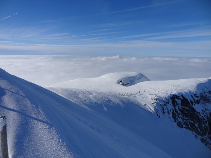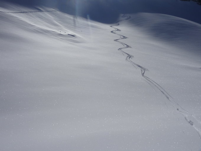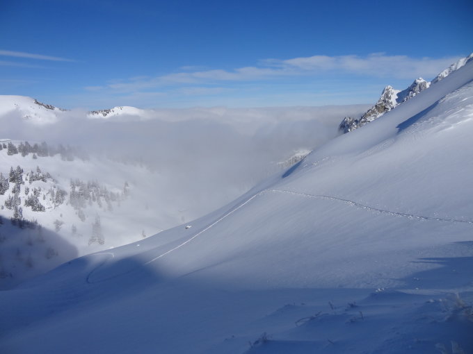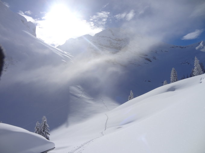 Abfahrt bis Combi war erste Sahne. Danach kurzer Aufstieg, um direkter nach Cerniets zu gelangen. Dort in den aufsteigenden Nebel eingetaucht. Der Aufstieg zum Patraflon war dann wider Erwarten noch nicht gespurt und leider sehr klebrig, also noch mal kräfteraubend. Dort dann schönste Spätnachmittagssonne knapp über dem Nebel. Abfahrt durch das NE-Couloir hatte besten Schnee, nur war nach einem Drittel die Sicht gleich null. Im kompletten Whiteout bis zu den ersten Bäumen gekurvt und zweimal hingefallen (das Gelände war nicht erkennbar). Danach dank guten Geländekenntnissen und Baumkontouren bis Schwarzsee getappt. Schade um den bis unten schönen Schnee, den man so leider nicht ganz geniessen konnte.