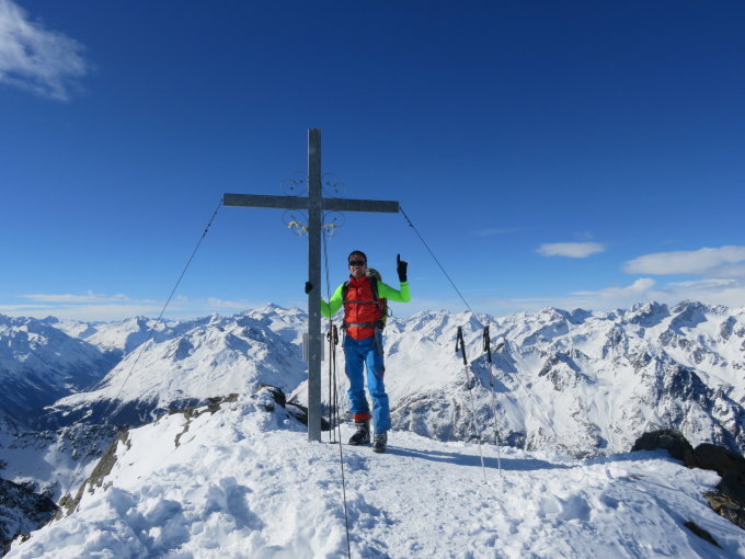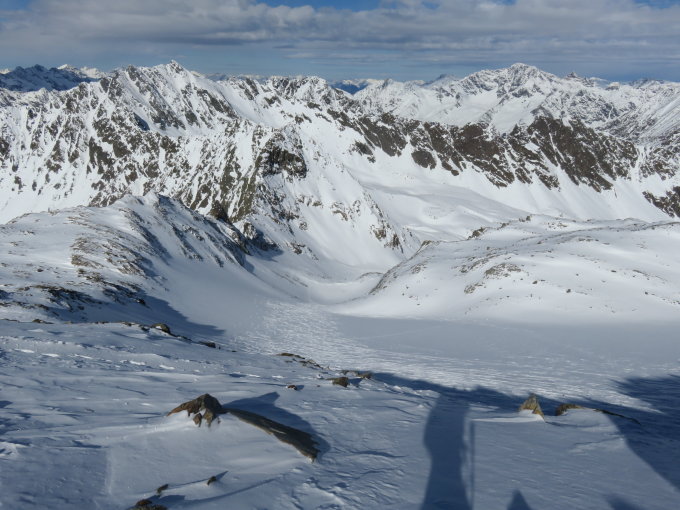 Lawinengefahr aktuell überschaubar. Eingewehte Rinnen durch den Föhnsturm sollten dennoch gemieden werden. Größere Gefahr droht aktuell aufgrund der sehr geringen Schneemenge durch Steine v.a. im Steilhang vom Roßkar bei der Abfahrt. Es ist hilfreich beim Aufstieg bereits die geeignete Abfahrtsroute zu wählen ( Steine!).