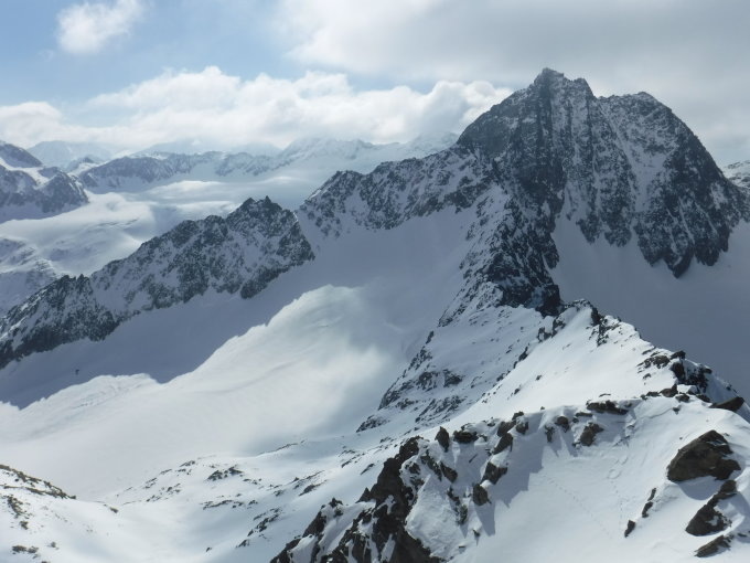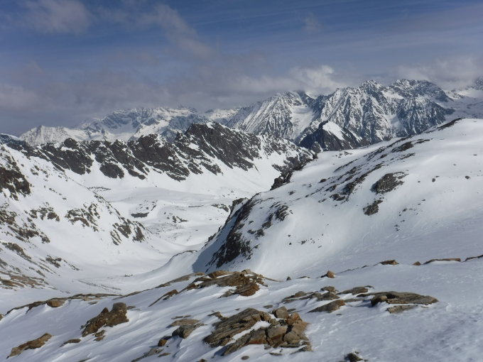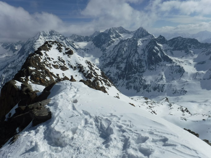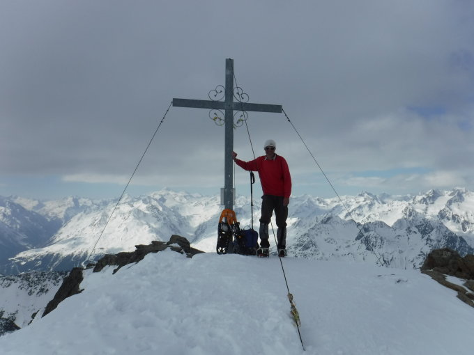 Tourenbeginn um 04:30 Uhr bei -2°C. Morgens noch Sonnenschein bis 10° C. Am Vormittag kam schnell Bewölkung auf. Im Aufstieg alles überfirnt, so daß man mit den Schneeschuhen schnell vorwärts kam. Lediglich der obere Bereich vom Roßkarferner war pulvergepresst beschickt, so daß ich über diesen mit Steigeisen abstieg bei aufkommender Erwärmung, da die SS dann rutschten.