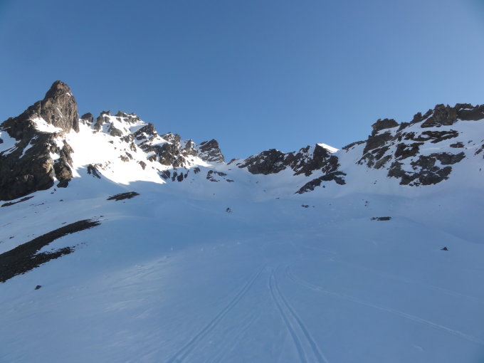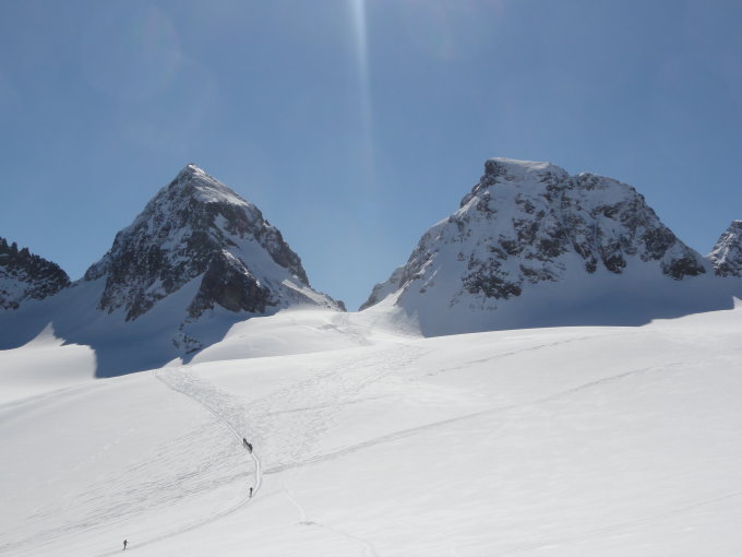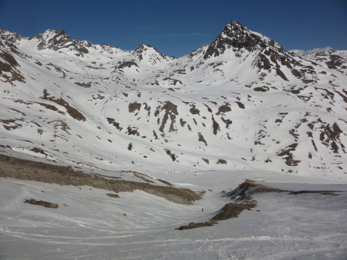 Egghorn - Chamanna Tuoi: Südlich durch eine Engstelle runtergefahren und auf dem Vadrett La Cudera in ausgezeichnetem Sulz bis zur nördlichen Lücke des Plan Mezdi. Mit etwas Träppeln und Stöckeln hoch. In bestem Sulz runter bis zur Chamanna Tuoi.