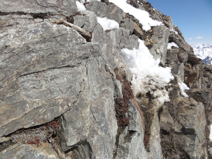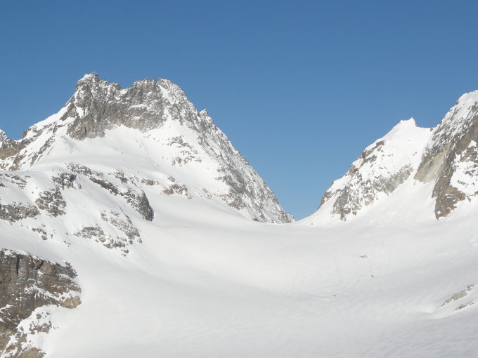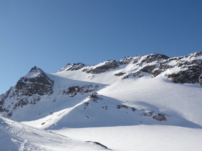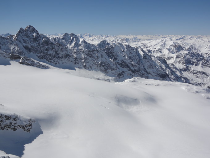 Chamanna Tuoi - Silvrettahorn: Die steilen Rinnen südlich vom Cronsel hoch sind am frühen Morgen mässig gut zu begehen, da die gefrorenen Spuren und Sulzhaufen die Spuranlage etwas behindern. Auf dem Vadrett Cudera gut 15cm Neuschnee von der vergangenen Woche. Diese sind noch weich oder leicht windgepresst. Die Fuorcla dal Cunfin hoch, ebenfalls über gefrorene Sulzspuren. Auf der Abfahrt auf dem Ochsentalgletscher hatte es noch schweren Pulver. Wiederaufstieg über komplett geschlossenen Gletscher bis zur nördlichen Egghorn-Lücke. Skidepot auf ca. 3140, mitten in der bereits etwas weichen und abgeblasenen Flanke. In sehr angenehmen Trittfirn bis knapp auf den Vorgipfel. Diesem westlich über den Sommerweg entlang auf den relativ exponierten Abschnitt bis zum Gipfelaufschwung auf den Hauptgipfel. Alle Felsgriffe sind frei und die Schneetritte sind halten. Steigeisen und Pickel sind sehr hilfreich.