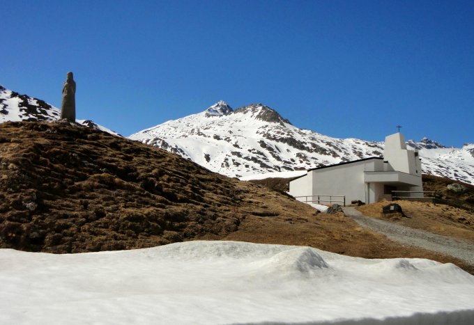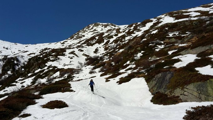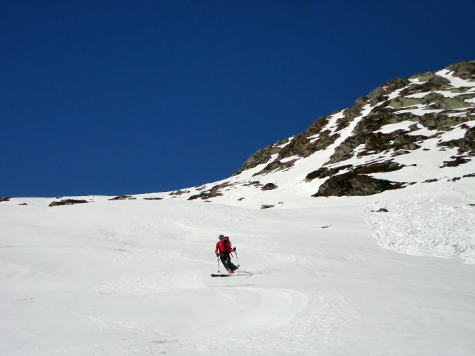 Gute Schneelage noch für die ostexponierten Touren ab Passhöhe. Etwa 20 Minuten Ski um den See tragen, dann durchgehend Schnee. Nach den ersten 150 etwas mühsamen Höhenmetern zwischen Büschen, in Rinnen und über gefrorene Abfahrtsspuren schönes und sonniges Skigelände. Gipfelaufstieg mit Steigeisen gemacht, da unter weichem Schnee stellenweise eisig, sind aber nicht unbedingt notwendig.