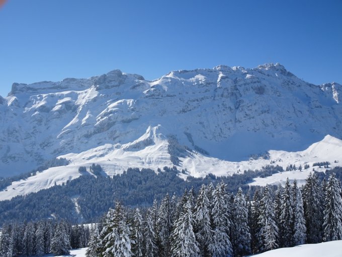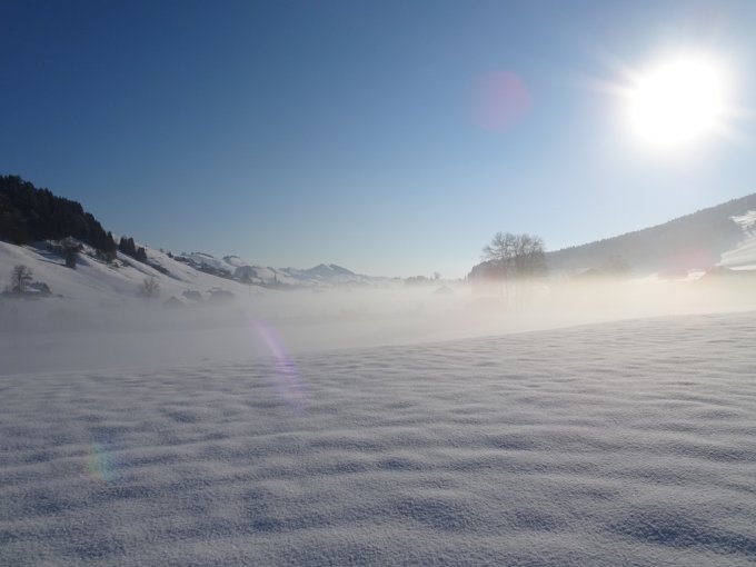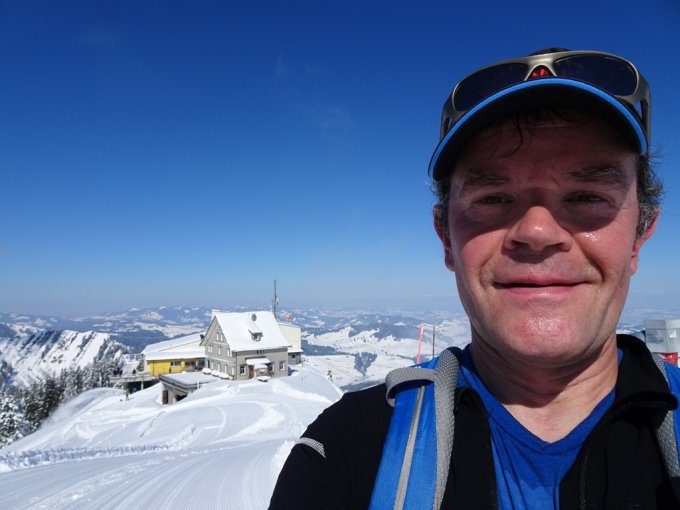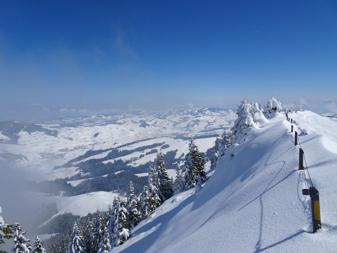 Bis zur Scheidegg eine Solo-Abstiegspur vom Vortag in etwa 60 cm tiefem Neuschnee vorgefunden. Ab der Scheidegg jungfräulich präparierte Piste, die aber alles andere als gut tragend war, darum habe ich hier die Schneeschuhe angezogen. Neben der Piste etwa 80 cm Neuschnee.