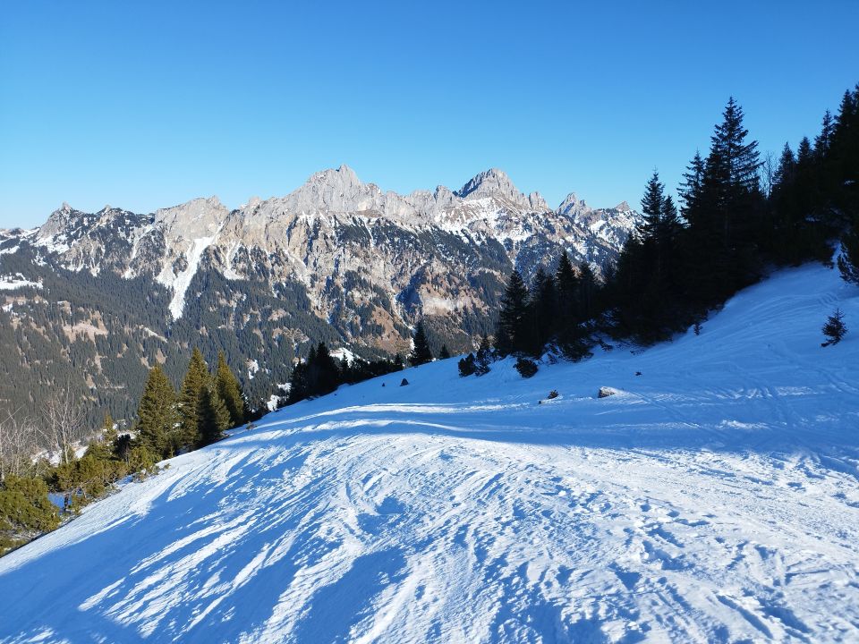 8.15 Uhr Start am Parkplatz der Krinnenalp-Talstation. Skigebiet z.Zt. nicht in Betrieb-Krinnenalpe geöffnet. Über die Natur-Piste Aufstieg ab Talstion über Krinnealpe-Nesselwängler Ödenalpe- zum Südrücken und mit Ski bis zum Gipfel. Südseitig Schnee unterhalb Gipfel aktuell noch gerade ausreichend. Über Piste perfekte Verhältnisse bis ins Tal.