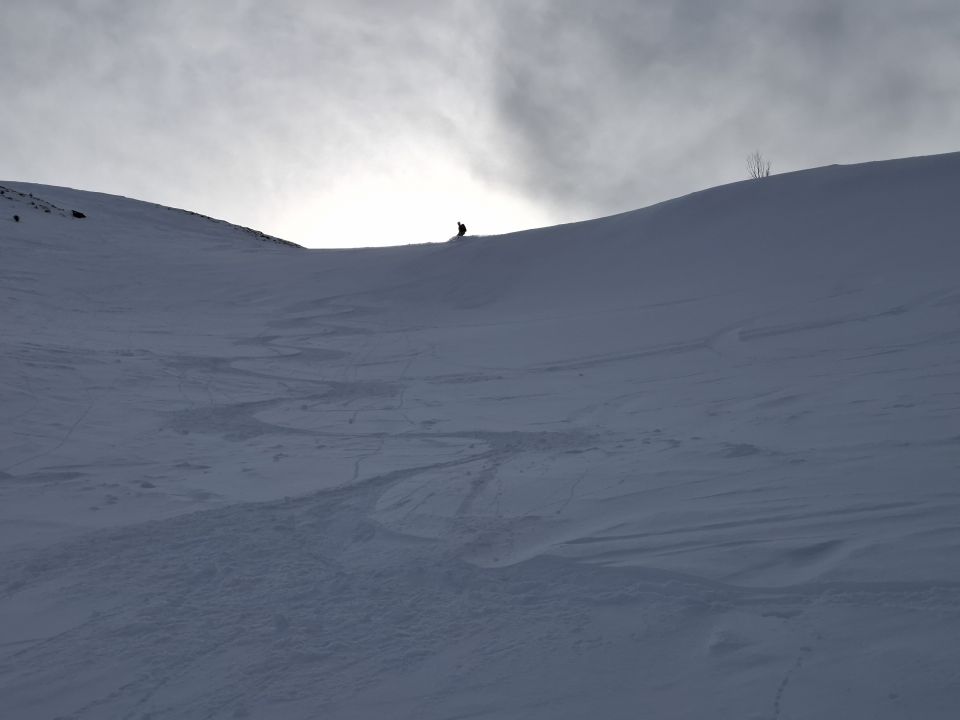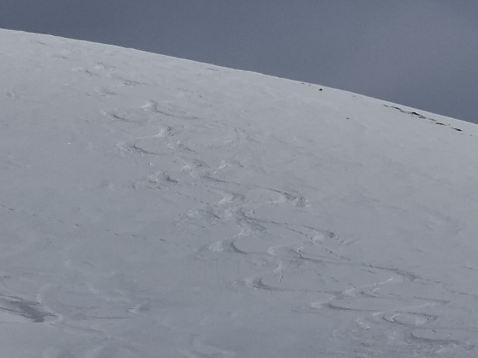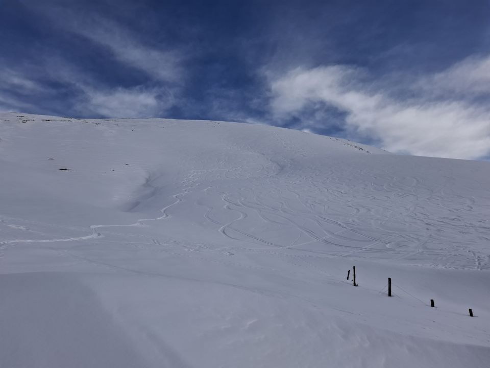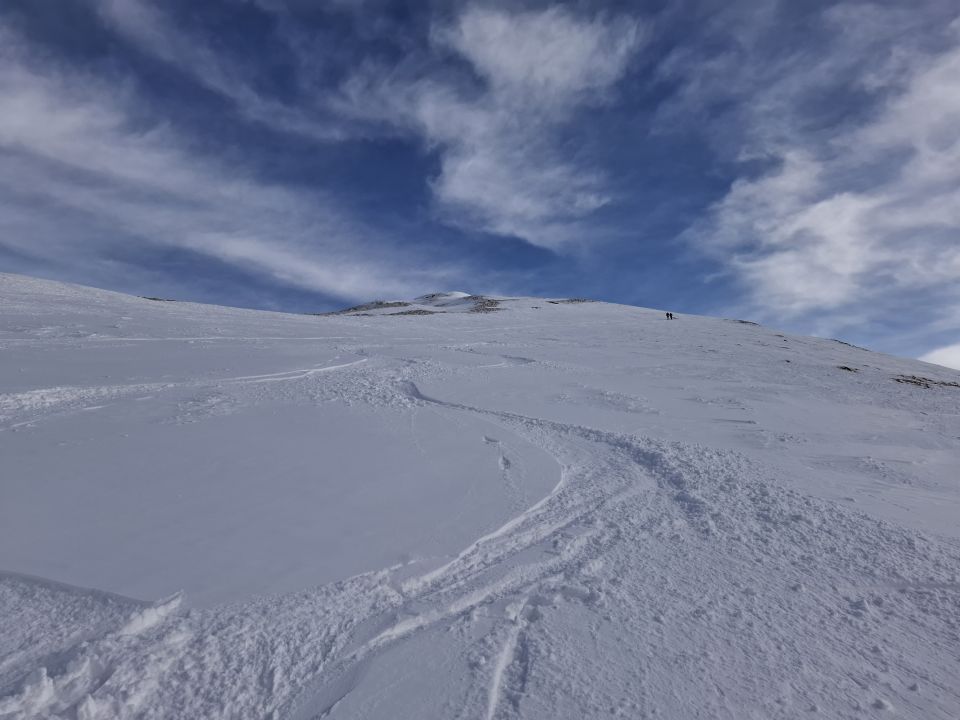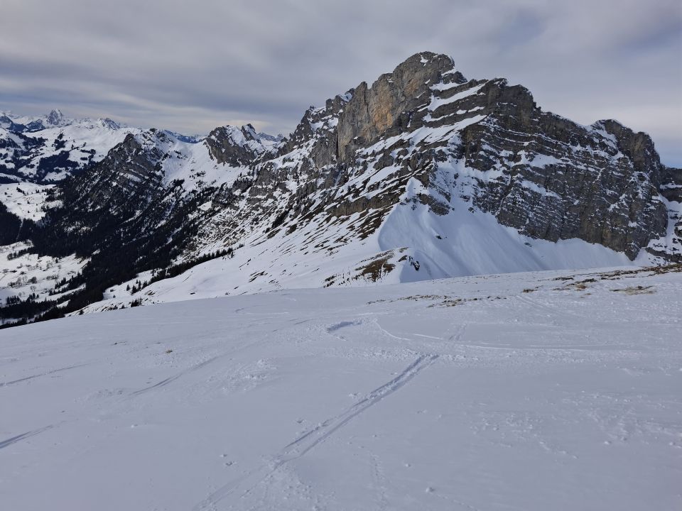 Wetter: Start um 8.20 bei - 6°C. Morgens recht Sonnig. später etwas bedekt im wechsel mit Sonne. Auf dem Gipfel unangenehmer kalter wind. Strasse bis zur Brücke 1570 sehr gut eingeschneit. Danach im steileren Abschnitt kurze strecke mit wenig Schnee. Danach wieder gut. Es hat über Nacht 5cm Neuschnee gegeben. Gipfelflanke. Grossflächig abgeblasen. Es hat aber Schmale korridore in denen der Neuschnee geblieben ist. Dort war die Abfahrt recht gut. Im Aufstieg waren dort die Harscheisen angenehm. Wir haben einen Abstecher zur Alphütte bei Furggi gemacht. Dort waren die Verhältnisse sehr gut. Wiederaufstieg in 10 Minuten zur Grimmifurggi. Dort findet sich immer noch Pulverschnee Abfahrten wer sucht.