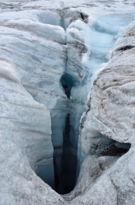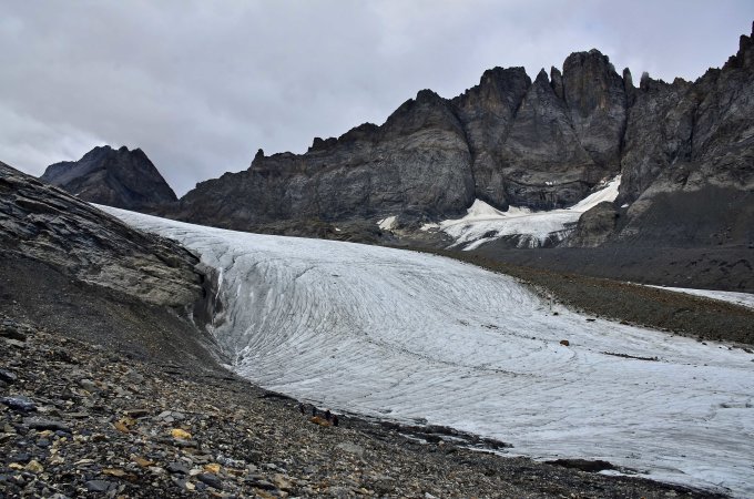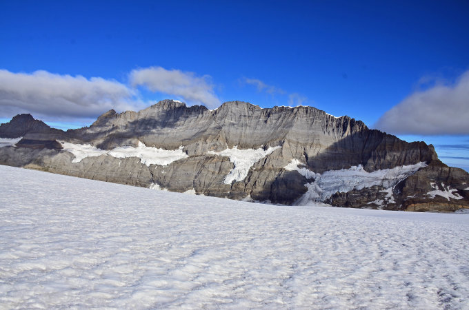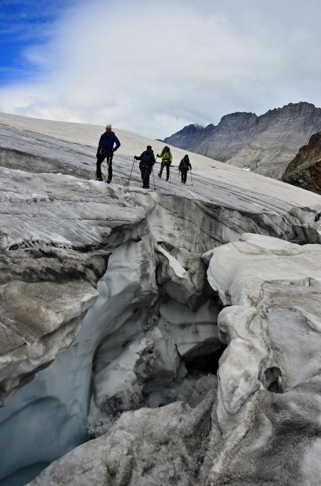 Kaum noch Firn auf dem Gletscher wie zu erwarten war. Für besseren Halt auf einige kurze blanke Stellen waren die Steigeisen sehr nützlich.