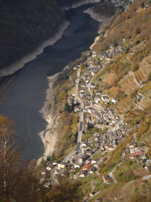 Der Stausee Lago di Vogorno führt z.Zt. wenig Wasser, so daß die Treppen des früheren Weges nach Vogorno, bevor das Tal geflutet wurde, von der großen Straßenbrücke bei Costa di Berzona aus sichtbar sind. Ein Teil des Dorfes Vogorno wurde im Sommer 1965 überflutet. Die Häuser am Hang oberhalb neu erbaut.