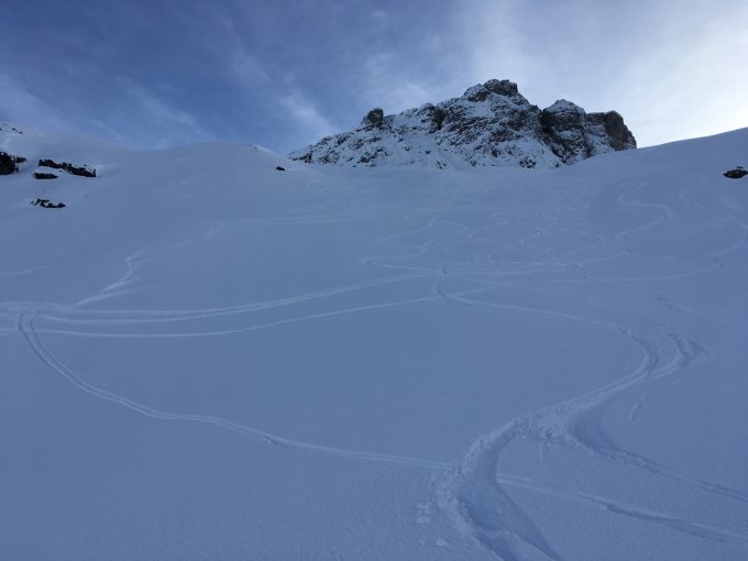 Wir fuhren unter Gipfelaufbau nach N zum Grüenboden, zu den Rossplatten und schliesslich zum Unterstaffel. Topverhältnisse, Traumpulver, leicht gesetzt.