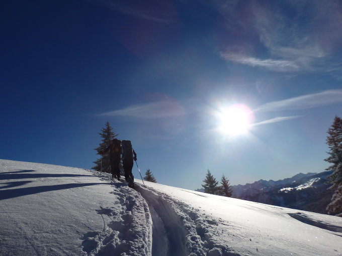 Wolkenloser Himmel und Windstille; 20-40 cm lockerer Pulverschnee, teilweise ohne feste Grundlage, schattseitig schön zu fahren; südseitig schon leicht angefeuchtet und gesetzt.