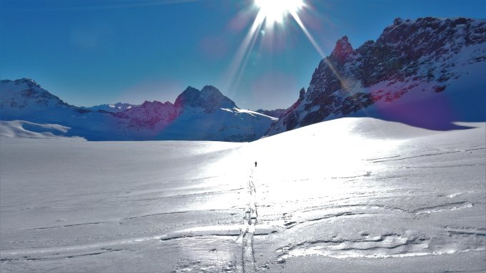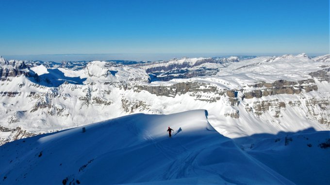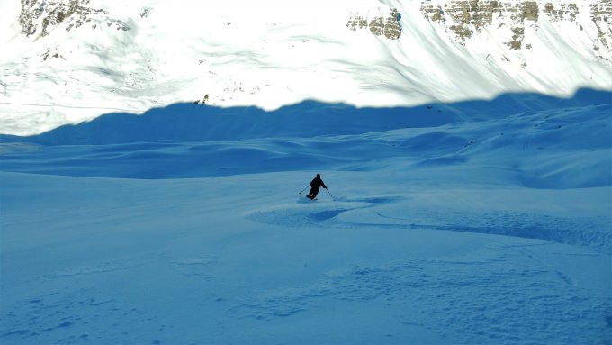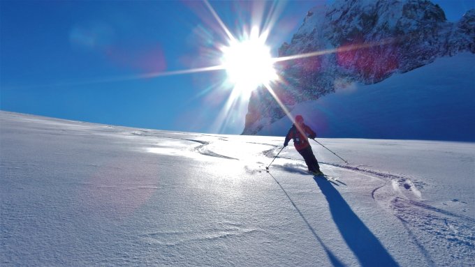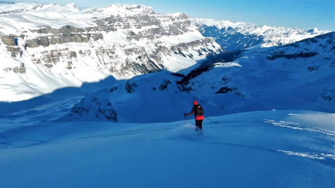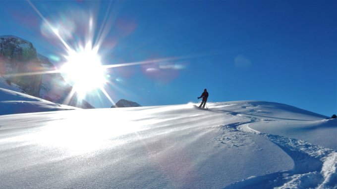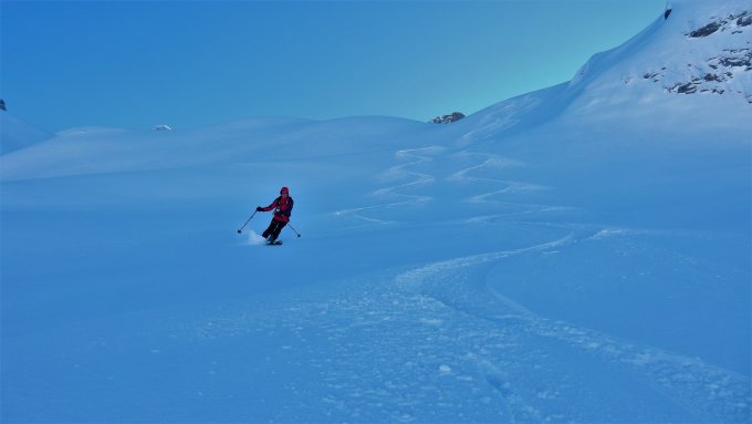 Hartschnee und Bruchharst bis zum Jägerbalm dann Pulverschnee, teilweise vom Winde bearbeitet bis zum Gipfel.