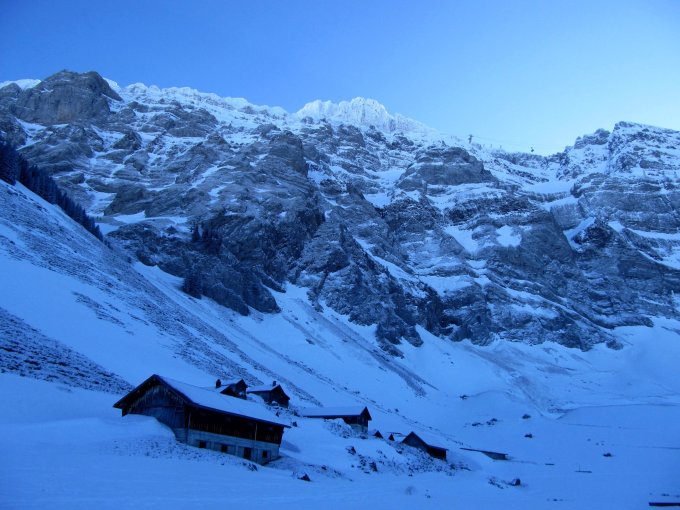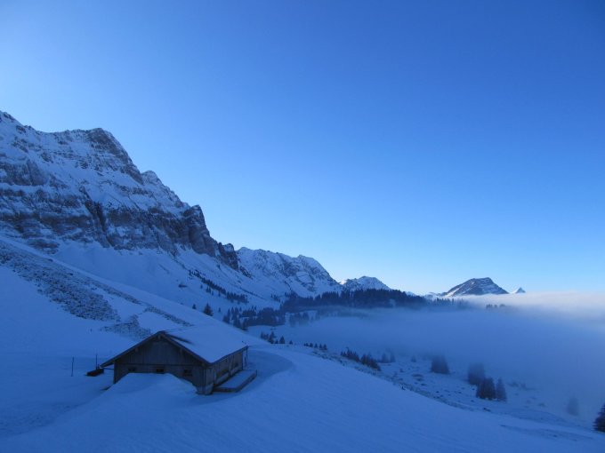 Start im Hochnebel bei Minusgraden. Burglind hat auf der Schwägalp heftig gewütet. Was der Wind nicht verfrachtet hat, wurde durch den Regen an den Hängen weggeputzt. Bei den Alphütten gab es tiefe Furchen im Schnee. Es müssen richtige Sturzbäche durch die Schwägalp-Ebene geflossen sein.