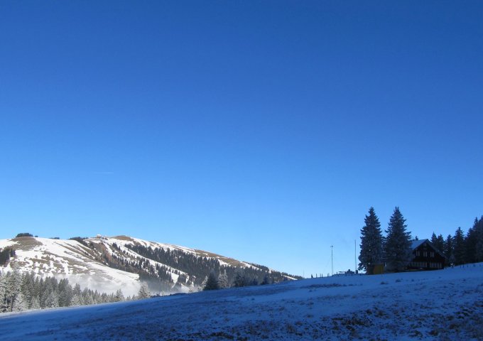 Eisige Kälte im Kaltluftsee auf der Schwägalp. An den Südhängen des Kronbergs "grünte" es bereits wieder.