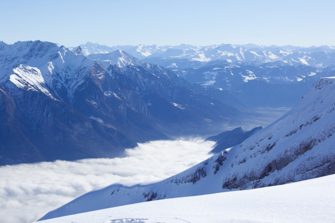Heute reltiv wenig begangen, da bickelharter Schnee auf der gesamten Route, was den Aufstiegs- und Abfahrtsgenuss doch etwas trübte. Letzte 150 Hm mit Steigeisen auf- und abgestiegen, uns war das im Ggs. zu den anderen Gruppen mit Ski zu heftig.