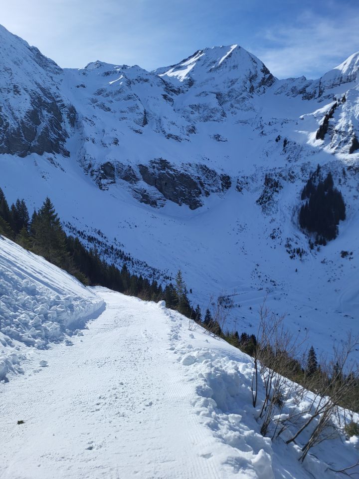 Die Abfahrt war deutlich besser als erwartet, ich habe mich von oben gesehen links gehalten (siehe GPX Track). Es hat teilweise sogar noch Pulverschnee. Ab Pt. 1834 hat es eine Pistenraupenspur bis ins Tal. Die Abfahrt auf der Strasse ging problemlos bis zum Parkplatz.