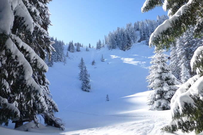Ca. 30 bis 40cm Pulverschneeauflage auf guter Grundlage - in den Flachpassagen meist schon zuviel. Gute Spuranlage.