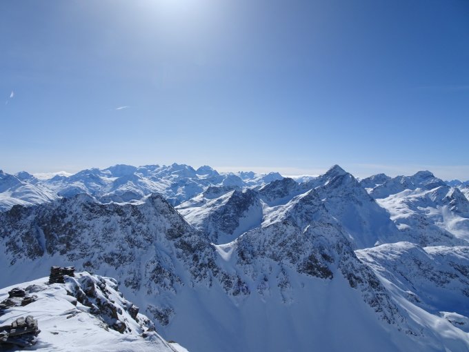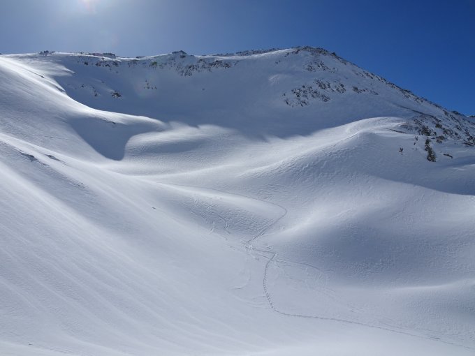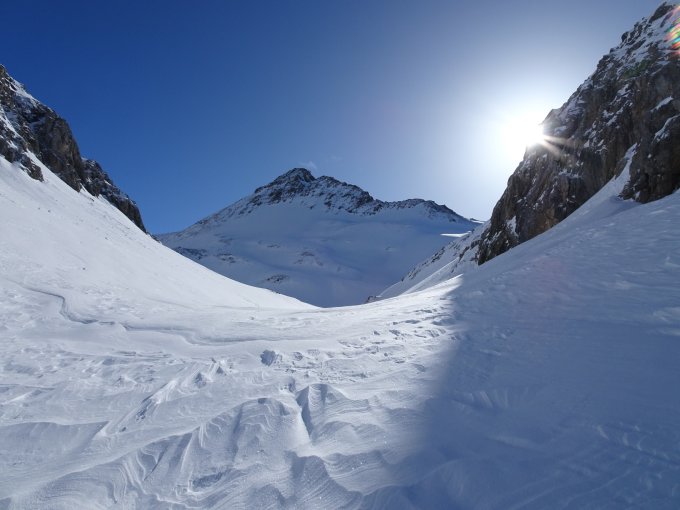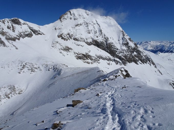 Bis auf ca. 2350 Meter gute Spur vorgefunden mit wenig Pulverauflage. Danach vom stetigen Ostwind Aufstiegspur zugeweht und kaum bis nicht mehr ersichtlich. Bis zum NE-Grat Spurarbeit in allen möglichen Schneearten; von windgepresst über Bruchharst bis zu 20cm tiefem eingeblasenem Schnee… Grat ziemlich abgeblasen und die letzten Höhenmeter ohne Hartwaren gemacht.