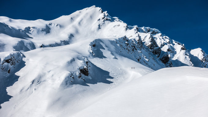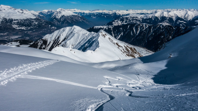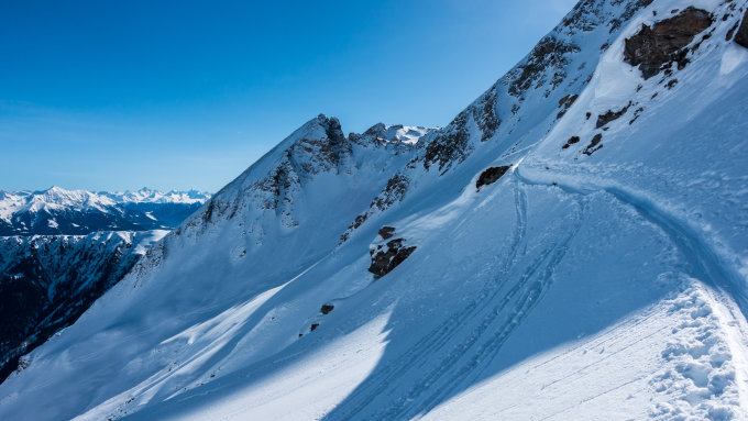 Start in Tenna bei +2°, wolkenlos und windstill. Beim Aufstieg in der Sonne sehr mild, was den schönen Pulverschnee der letzten Tage bis auf ca. 2100 m schnell in Nassschnee umwandelte. Als die Sonne hinter den Gipfeln verschwand bildete sich daraus ein übler Harschdeckel, der wohl mit der angesagten Kälte leider vorläufig so bleibt. Oberhalb 2100 m an Nordhängen noch super Pulver. Aufstieg problemlos auf guter Spur bis zum Gipfel. Beim Zugang im unteren Teil über die steile Südwestflanke des Nolla sind die üblichen Lawinenzüge zu überqueren. Die Traverse ist momentan sicher, da sich die Hänge bereits entladen haben. Die Überquerung der Lawinenkegel ist bei der Abfahrt etwas mühsam.