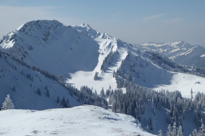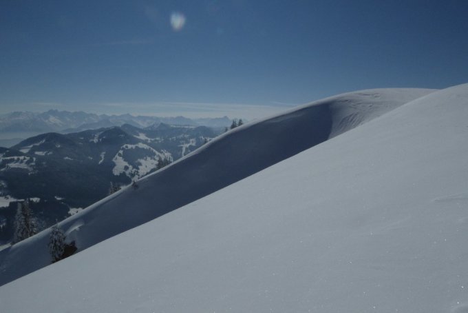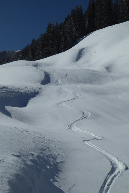 Kein Vergleich zum Montag am Bleicherhorn. Beste Sicht bei Prachtswetter, zwar immer noch kalt aber ohne nennenswertem Wind. Schnee immer noch reichlich und gut. Allerdings waren die freien Hänge um die Grathöflealp ziemlich hart und ohne Auflage. Hier war ich dankbar, dass ich die Harscheisen dabei hatte. In der Abfahrt oben etwas hart aber griffig. In geschützen Lagen immer noch klasse Pulverauflage.