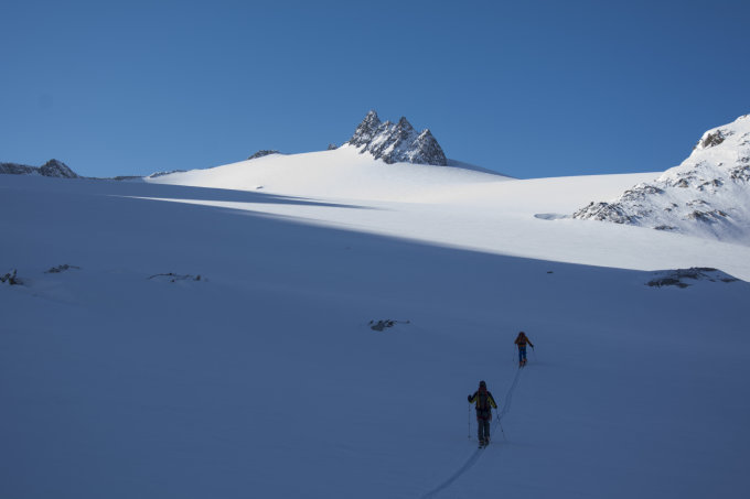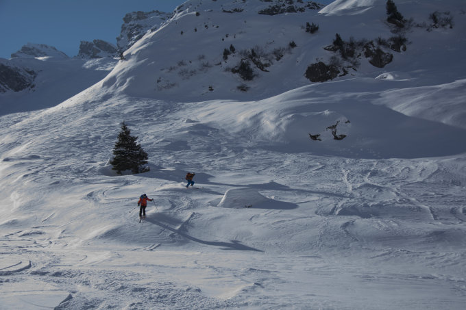 Wir sind am 26.2. von Curaglia zur Camona da Medel aufgestiegen und haben die Russische Peitsche in diesem alpinen und wilden Ambiente hautnah zu spüren bekommen. Am 27.2. haben wir beim Skidepot minus 28°C gemessen und auch die Bise hat auf dem Gletscher das Seine dazu beigetragen, dass nur schon der Schutz vor Frostbeulen im Gesicht, geschweige denn das Steigeisenmontieren zur echten Herausforderung wurde. Am 28.2. sind wir zum Piz Uffiern aufgestiegen, mussten aber unterhalb des Gipfels die Segel definitiv streichen, da die Bise auf dem Glatscher da Medel so bissig war, dass man mit Erfrierungen hätte rechnen müssen. Wir liessen es uns aber nicht nehmen, die prachtvolle Nordabfahrt durch das Val la Buora nach Fuorns an der Lukmanier-Passstrasse in Angriff zu nehmen. Die Gletscher sind sehr gut eingeschneit, die Schneeverhältnisse vom Skifahren her eher durchzogen. Es hat von allem etwas: Auf dem Gletscher meist Presspulver, dann gibt es aber auch Zonen mit einem Windharschdeckel, in den Nordhängen aber auch noch schönen Pulver. Wir waren gestern und heute die einzigen Tourengänger in der Medelser Gruppe. Haben die arktischen Temperaturen das Ihre dazu beigetragen? Das Gebiet ist nämlich top, und die Lawinenverhältnisse waren es ebenso.