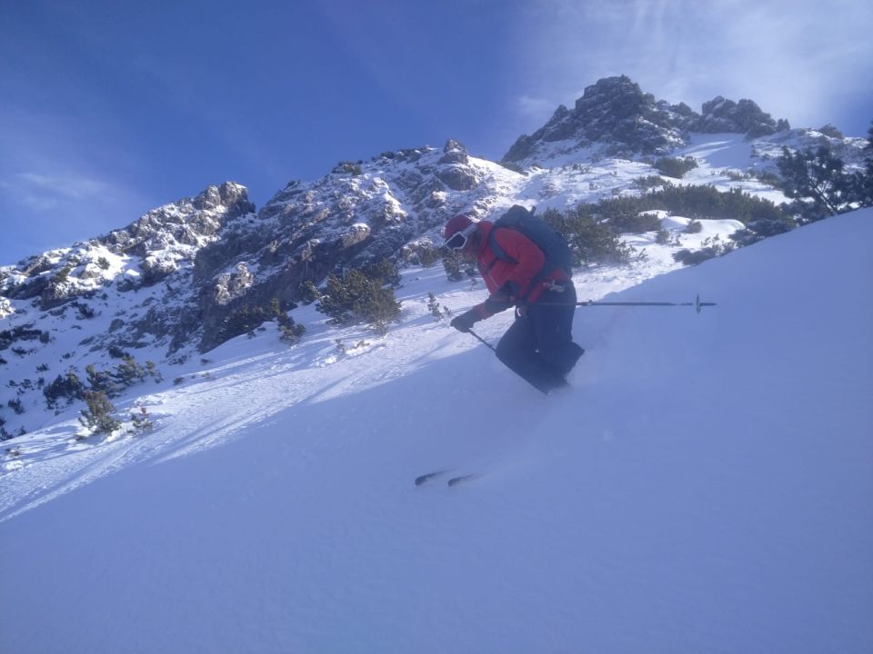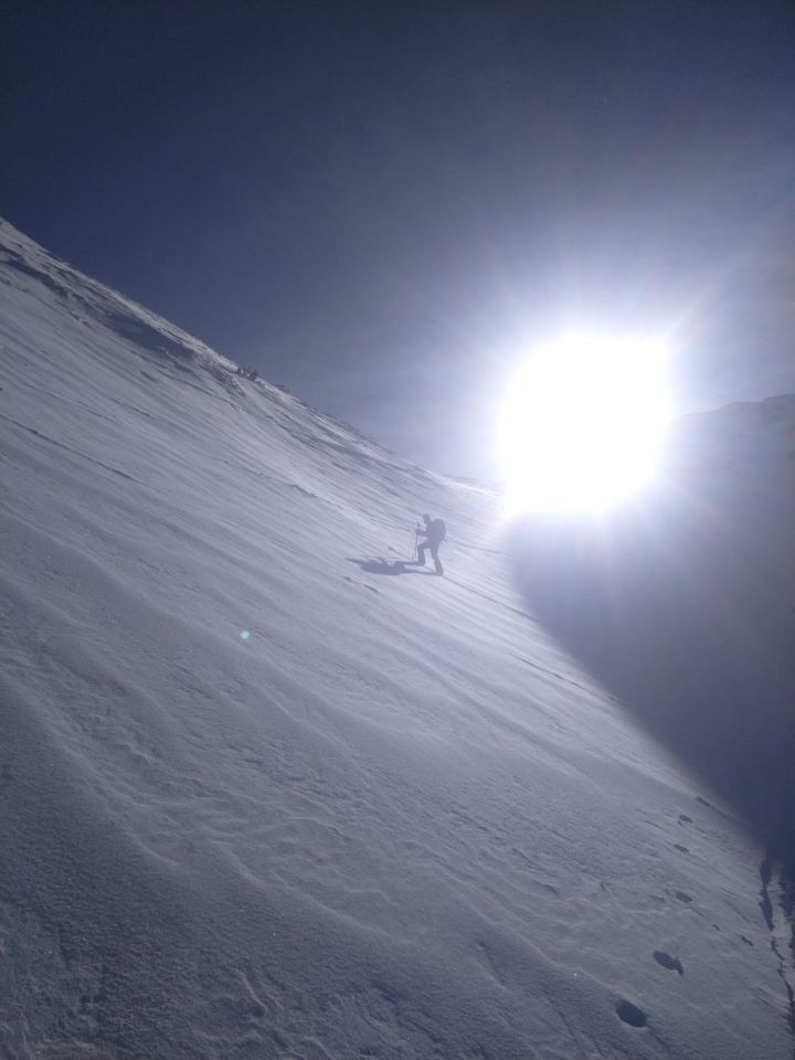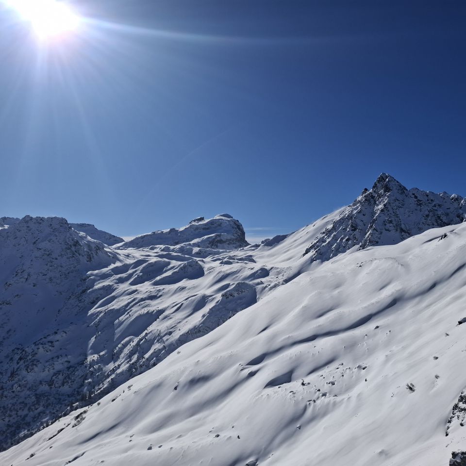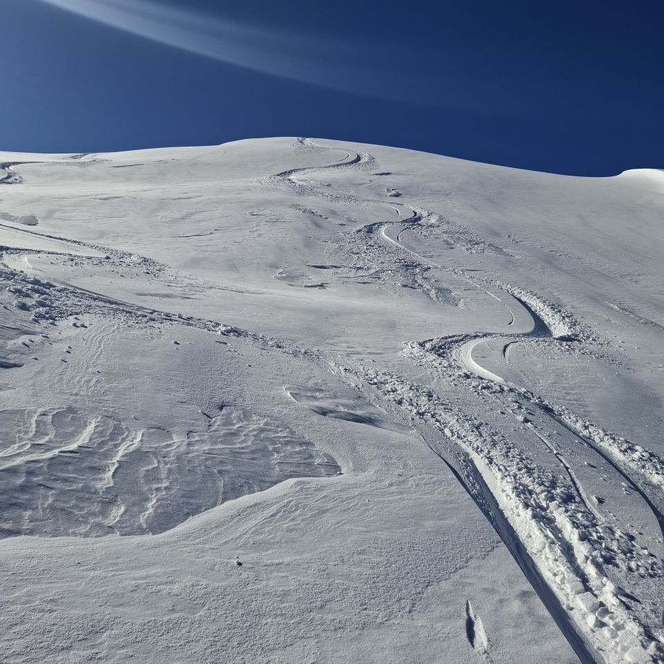Unser Weg führte uns zum Wintergipfel wo wir ca 500hm abgefahren sind in schönstem Pulver und nullllll Steinkontakt. Dann auffellen und grad gleich nochmals rauf. Vom Wind sind wir verschont geblieben, rundum sah man überall Windfahnen. Dann Abfahrt ähnlich wie Aufstieg. Bei 1500m Schnee nicht mehr so gut. Trotzdem an supr Tag gsi