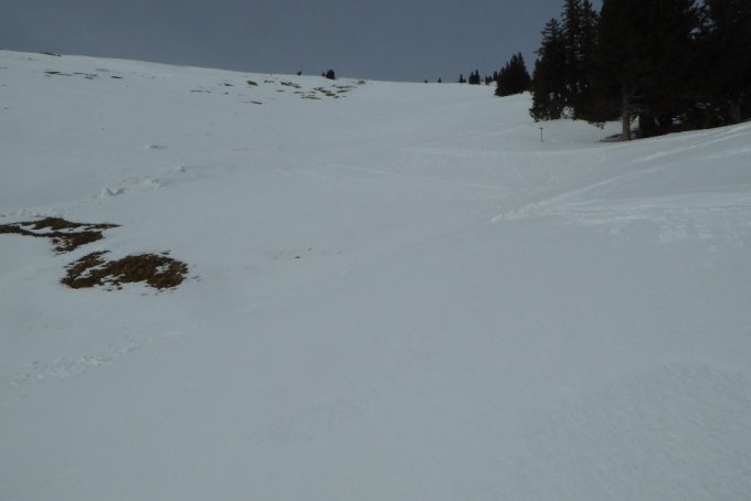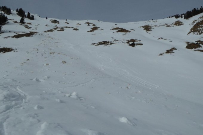 Aufstieg um den Serderer rum alles trockener Pulver, Gift für die nassen Felle (MEGA Stollenbildung). Die Südflanke hatte schon tiefen Firn, Oberflächenbollen mit kleinen Rutschen. Immer mal zurückschauen ist wichtig und mal etwas rausqueren, wenn was ins rutschen kommt. Z.T. im zentralen Bereich schon ordentliche Gleitschnee Abgänge.
