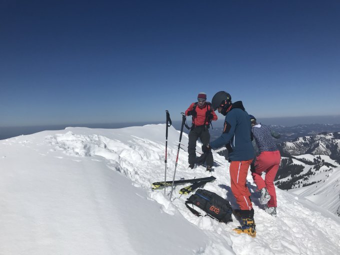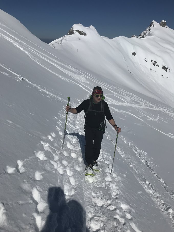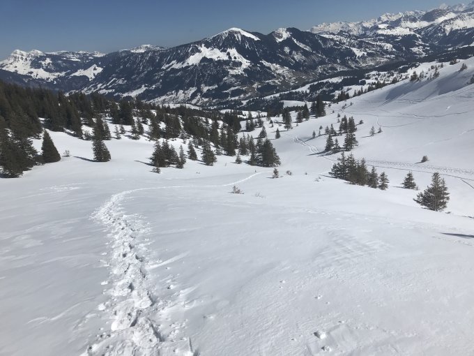 Immer noch sehr viel Schnee im Gebiet. Nur sehr wenige Geländebuckel abgeblasen. Bis und mit Abstieg (12:30) noch keine Schneerutsche am Schibengütsch.