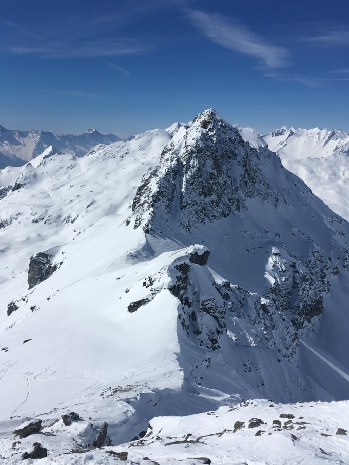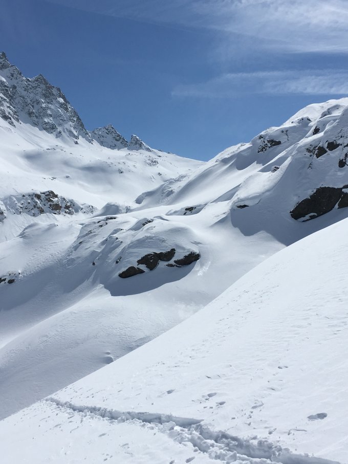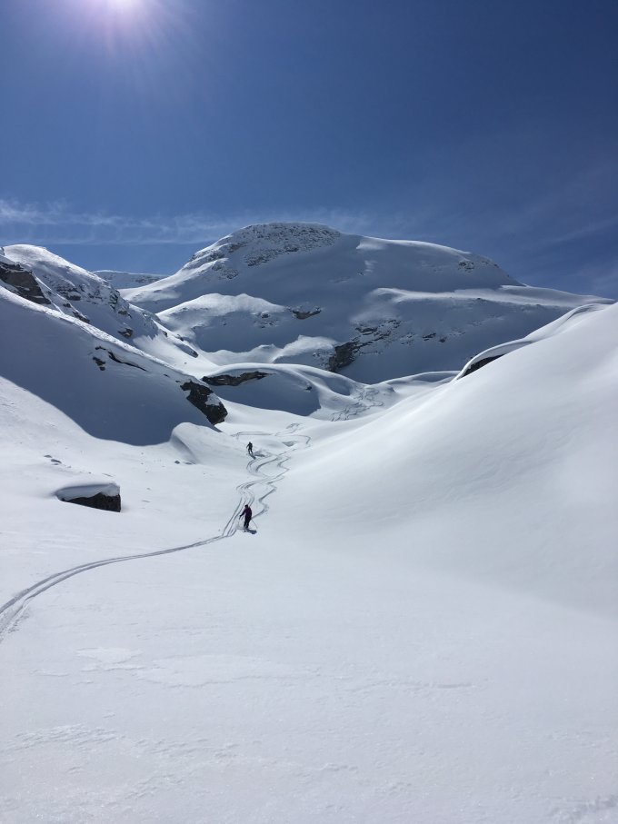 Minus 10 Grad und fast windstill bei Start. Bis 2620 m keine Sonne und kalt. Auf Nordostflanke warm, gute Spur bis Gipfel vorhanden, alles Pulverschnee, einige Abfahrtsspuren. Wir sind in die Ebene südlich P. 2465 abgefahren und wieder aufgestiegen Richtung Piz d Emmat Dadora 2850 m. Wir sind um den Felskopf P. 2581 in den Sattel unterhalb der Ostflanke Aufstieg Dadora aufgestiegen. Vom Sattel 2550 m Abfahrt nordwärts Richtung Julierstrasse, ein Traum, keine Spuren und bester Pulverschnee. Der Wiederaufstieg hat sich sehr gelohnt, empfehlenswert.