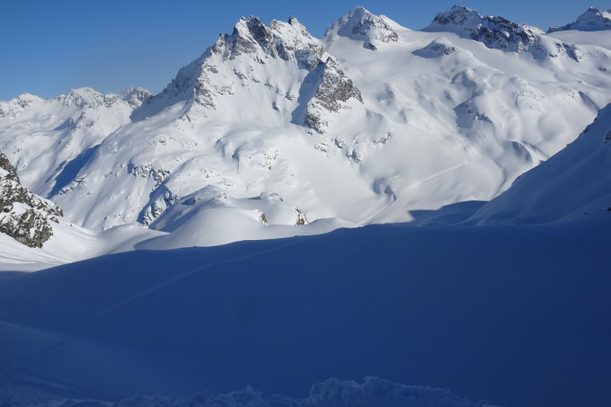 Nach wunderschöner Abfahrt von der Schneeglocke bei der Klostertaler Hütte wieder auffellen und Aufstieg zum Litznersattel mit anschließender Fahrt zur Saarbrücknerhütte. Hier auch wieder schönster Pulver.
