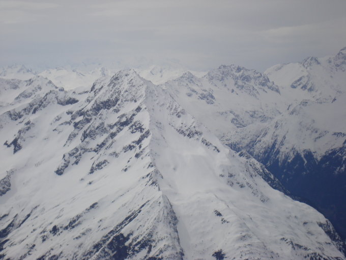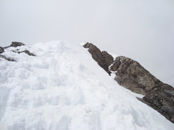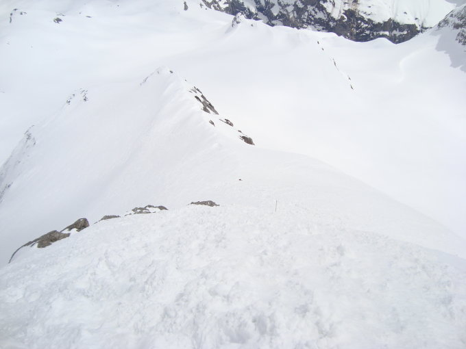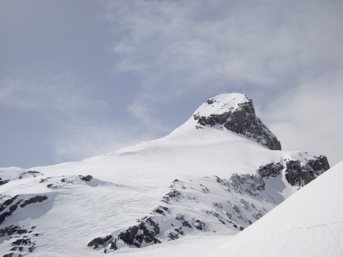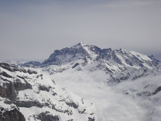 Bis zum Einstieg Ruchenchälen war die Schneedecke schon ziemlich feucht aber noch relativ gut tragend. Im Ruchenchälen dann zunehmend durchgefroren, was ab ca. Hälfte mit der Montage der Harscheisen gipfelte. Schon im Chälen blies ein sehr unangenehmer und starker Wind aus NNO, welcher beim Ausstieg aus der wie immer viel zu langen Chälen an Stärke unbarmherzig zulegte, da man nun offenes Gelände betrat. Auch der Himmel war eher bedeckter Natur, die Sichtverhältnisse jedoch ganz ok.